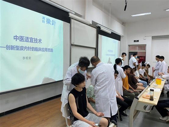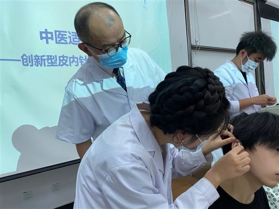 随后,在培训教师的指导下,每班分别选10名同学进行实际操作。同学们表示此次培训收获良多,对揿针疗法的优势病种和具体操作方法有了较深的认识,增强了实习、就业的信心。