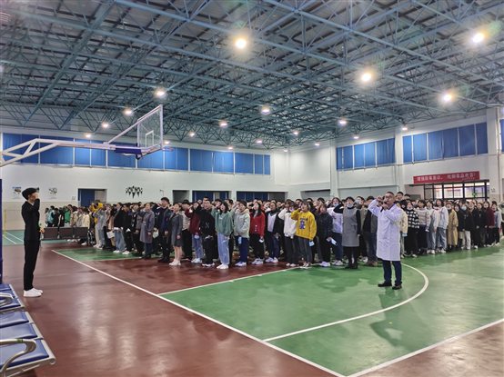 为强化医员工医德医风教育和专业思想教育,作为新生入学教育的一课,10月27日,304永利集团在经开区实训与服务中心的体育中心举行医员工宣誓活动,304永利集团直属党支部书记祝继英、经理江成鹏、副书记沈军以及团总支书记、辅导员、员工会干部和2020级510名新同学参加。