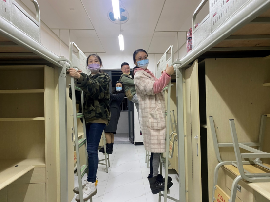 夜深了,年轻的老师们统一在公司后勤部门领取到床上用品,乐呵呵地在寝室上下铺上忙碌,并搞笑的摆造型,说笑这是难得的重温老员工生活的机会,其乐观向上的革命精神感染着每一位身边人。