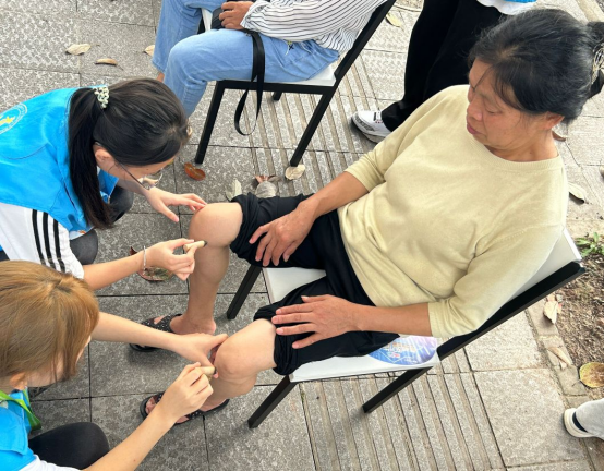 活动开始前,余杭同学安排义诊现场的布置并对志愿者们进行艾灸与推拿的相关技巧及注意事项的培训。随着居民们陆续到达活动现场,员工志愿者们向他们宣传科普艾灸、推拿等中医养生文化,引得居民们纷纷体验。同时,针对患有高血压、高血脂、糖尿病、颈椎病等常见老年病的社区居民,员工志愿者们耐心询问他们的日常生活习惯及身体状况,从日常良好习惯养成、饮食卫生、加强锻炼、家庭日常用药储备等方面给出了专业建议。