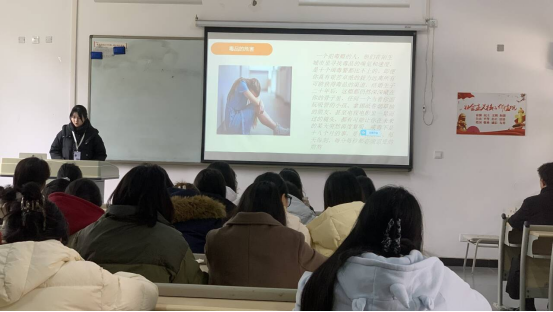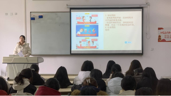 首先,黄敬榆同学阐释了毒品的定义、范围以及分类,用详实的案例及数据深入剖析了毒品对个人、家庭、社会的严重危害,并通过我国禁毒工作相关纪录片向同学们展现了禁毒历史进程、当下现状与艰难挑战。接着,夏可馨同学介绍了禁毒相关法律法规,分享了老员工预防毒品侵害的方法,呼吁青年员工应到积极投身到禁毒行动中,共同守护美好校园、和谐社会。随后,她们向同学们逐一发放禁毒宣传手册。