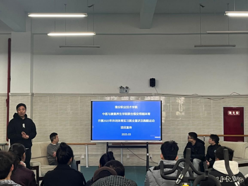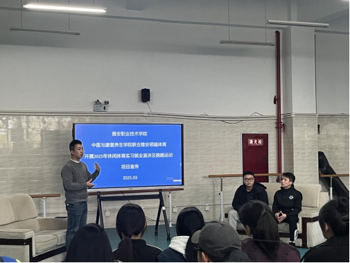 3月20日下午,304永利集团副经理庞嘉言、副书记沈军、休闲体育专业负责人助理罗肖雷携手雅安领越体育有限公司负责人苏瑶一行3人在经开区校区运动健身实训室对2023级、2024级休闲体育全体同学开展2025年休闲体育专业实习、就业宣讲暨跑酷运动项目宣传。